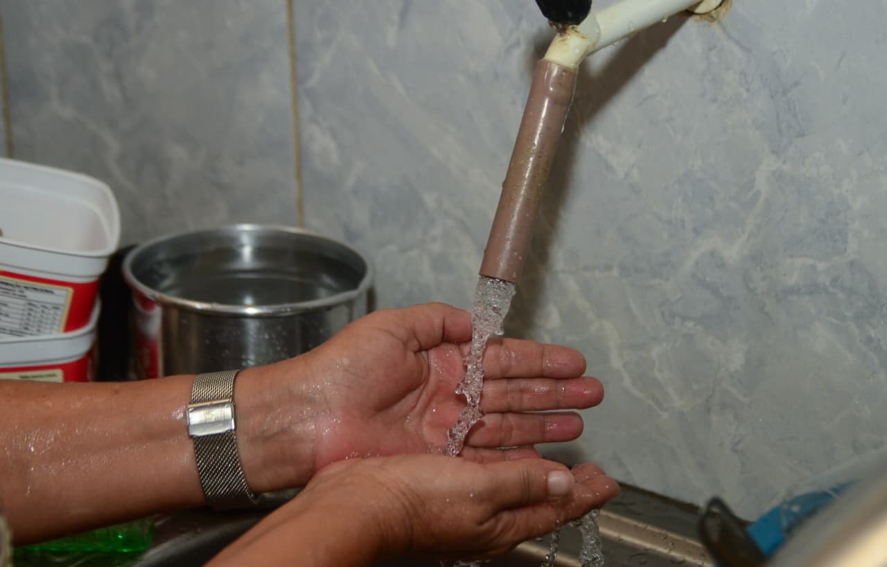 Água jorrando da torneira de moradora da Barrinha. Foto: Wilson Moreno (SECOM/PMM)
