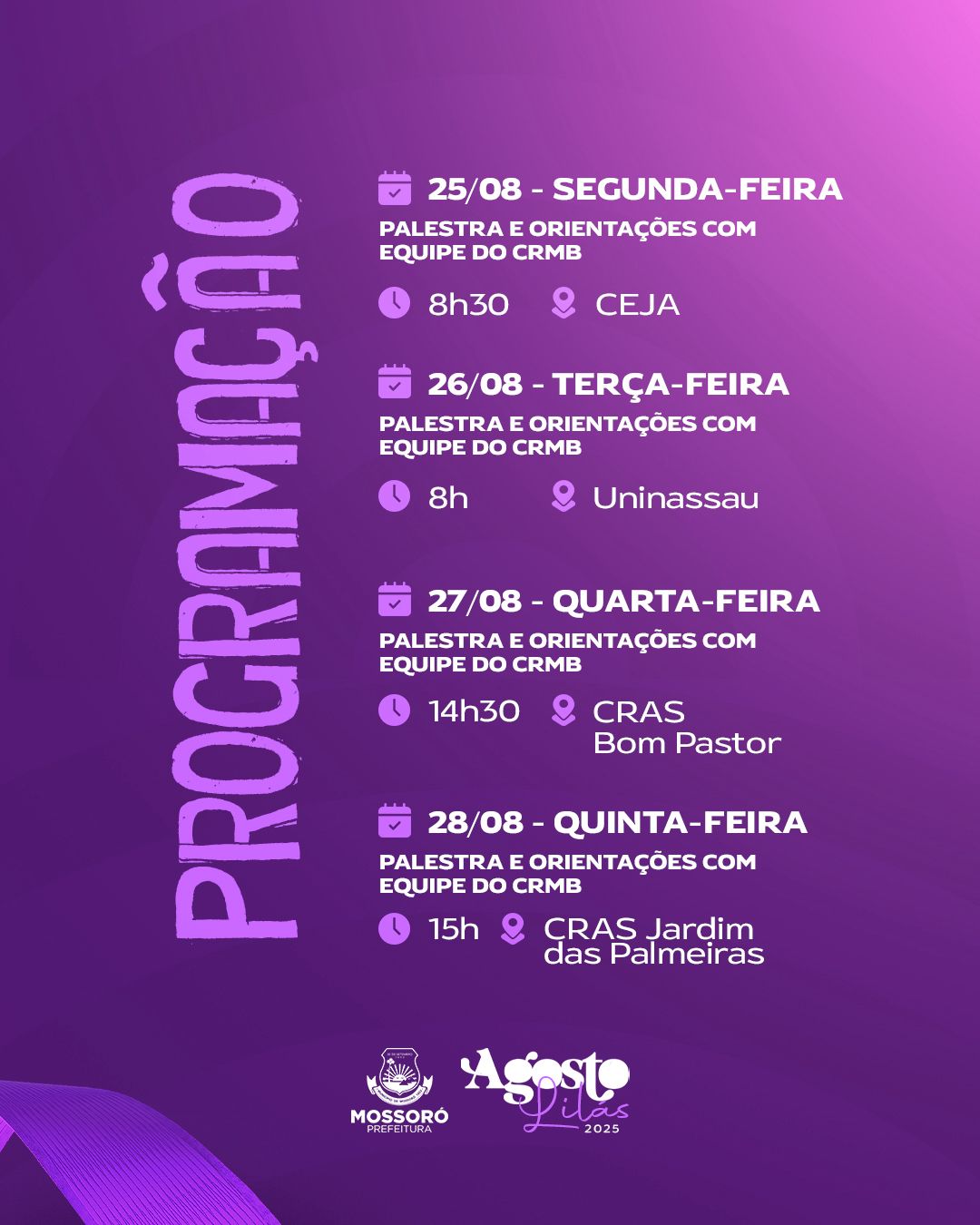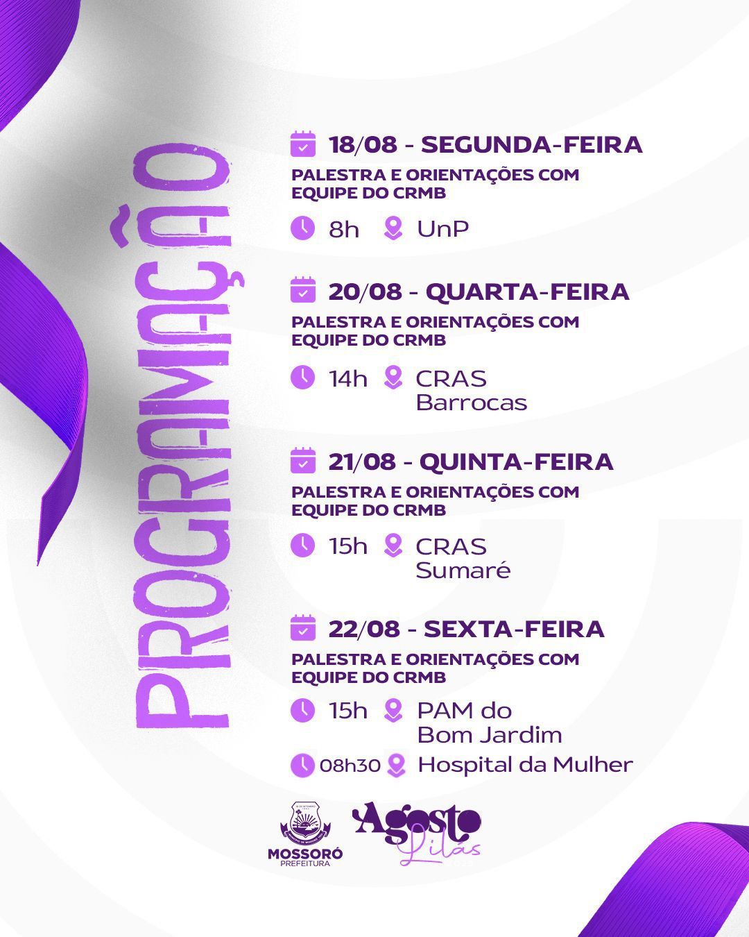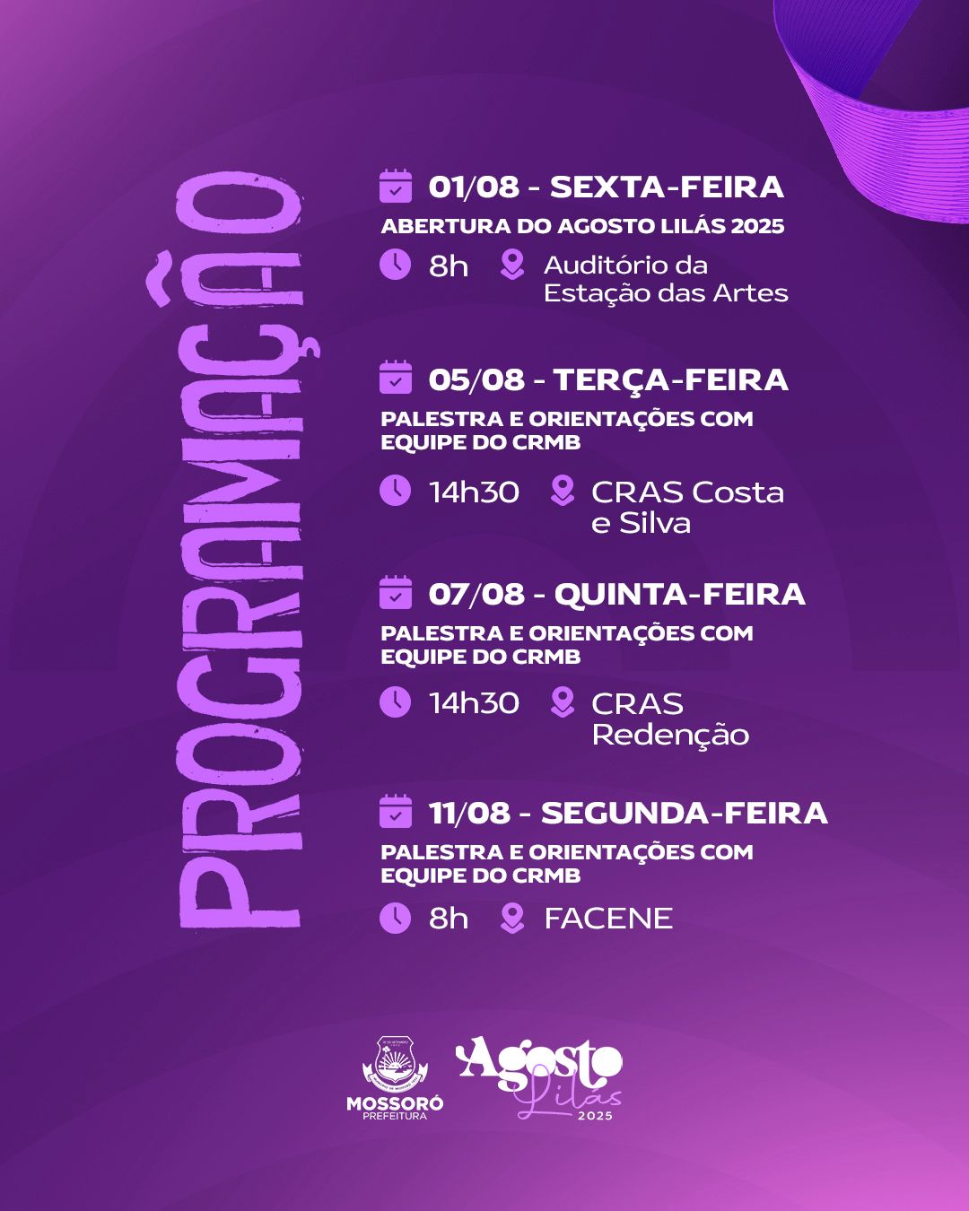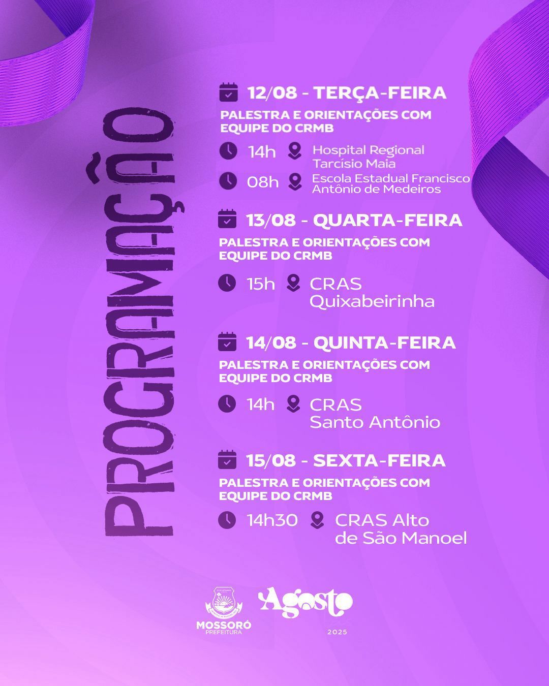 Durante este mês de agosto, a Prefeitura de Mossoró, por meio da Secretaria Municipal de Assistência Social, Cidadania e Juventude (Semasc), estará realizando uma programação toda especial, alusiva à campanha “Agosto Lilás” em equipamentos do município e também em instituições privadas.