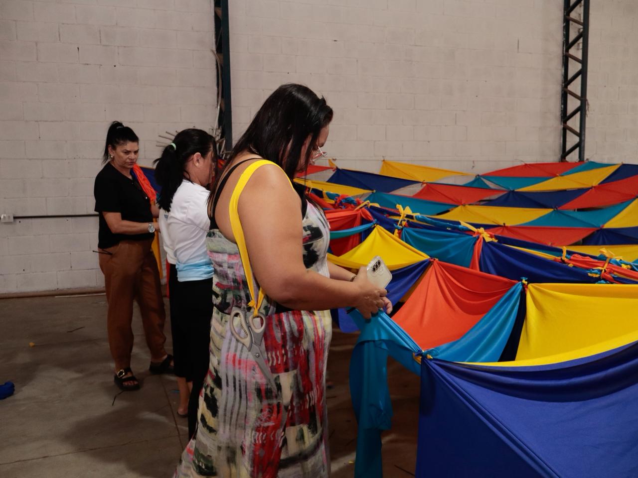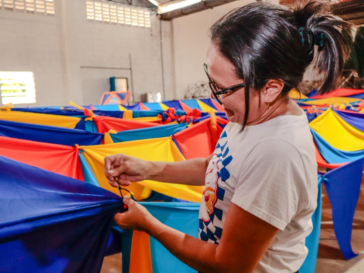 No barracão, profissionais confeccionam bandeiras, balões, entre outros artigos juninos. Adereços que, além das principais vias da cidade, irão também ornamentar os polos do MCJ 2026.