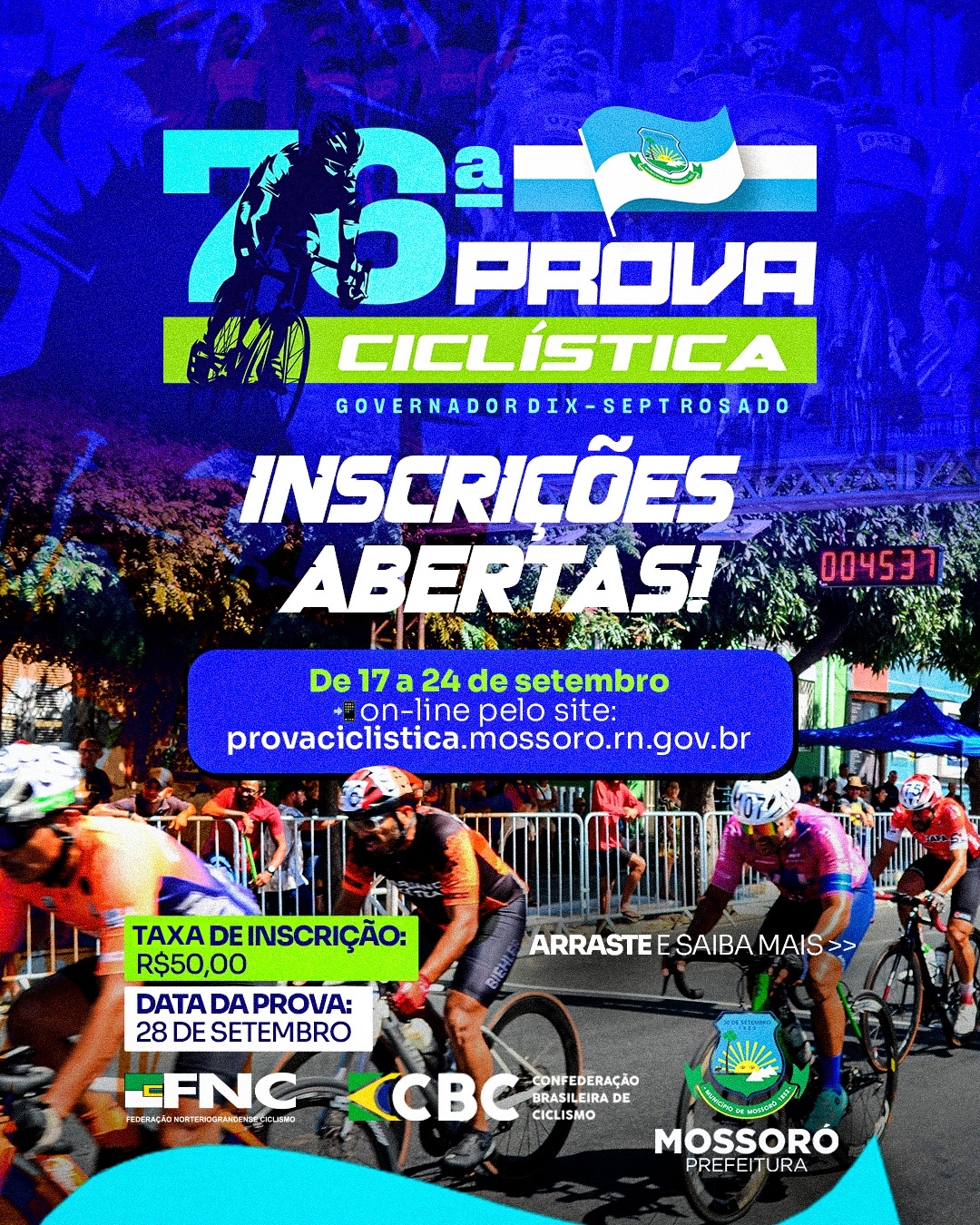 A Prefeitura de Mossoró, por meio da Secretaria Municipal de Esporte e Lazer (Sesporte), abriu nesta quarta-feira (17) as inscrições para a 76ª edição da tradicional Prova Ciclística Governador Dix-sept Rosado. O evento, um dos mais antigos da América Latina, será realizado no dia 28 de setembro (domingo), com largada na avenida Rio Branco.