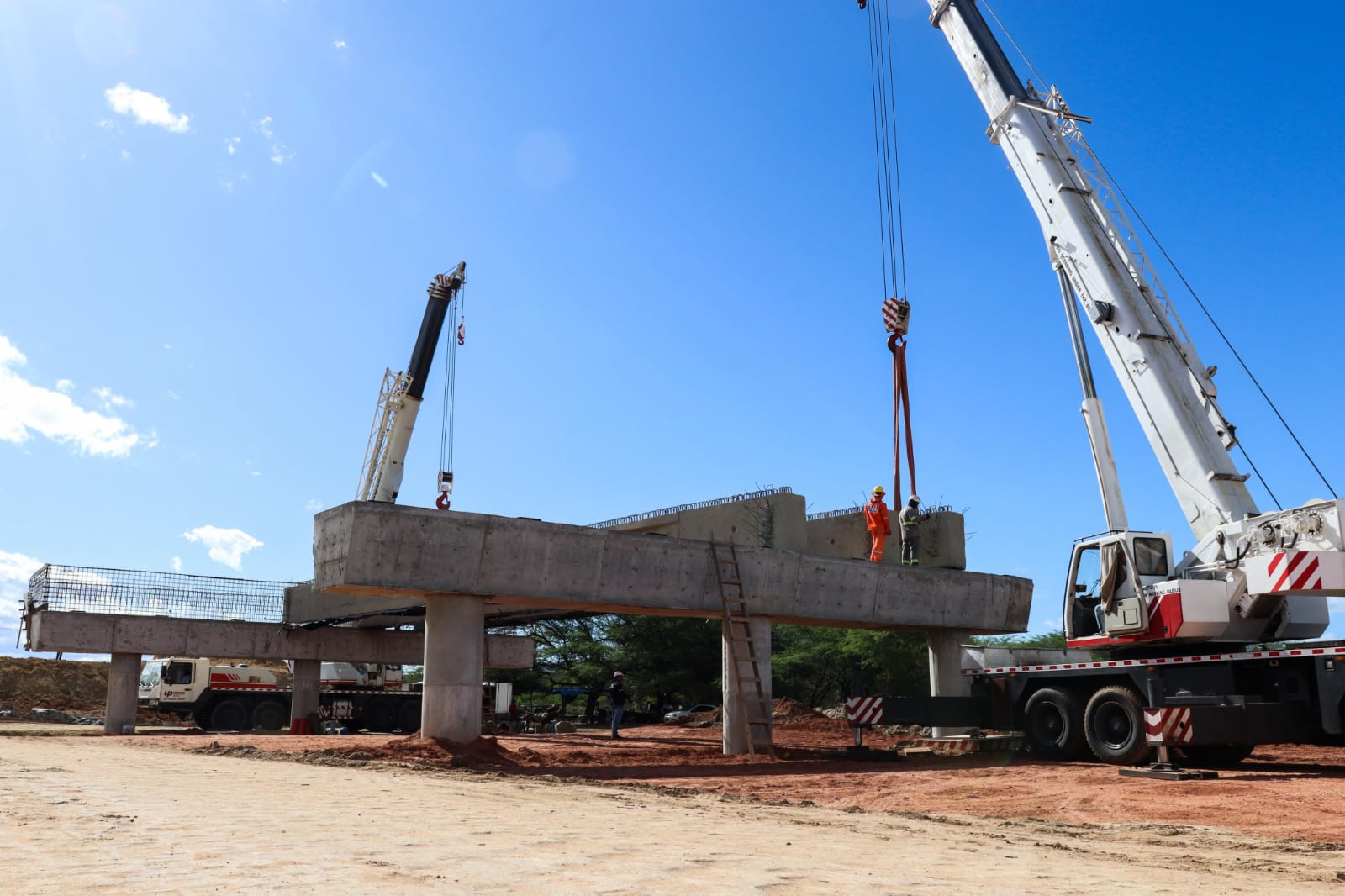 Após o içamento das 42 longarinas, será iniciada a instalação das lajes pré-moldadas, já concretadas. Em seguida, será executada a concretagem de acabamento, a aplicação da capa asfáltica sobre a ponte e, na etapa final, a sinalização da via e liberação do tráfego para circulação de veículos. Toda a obra contará ainda com iluminação inteiramentem em LED.