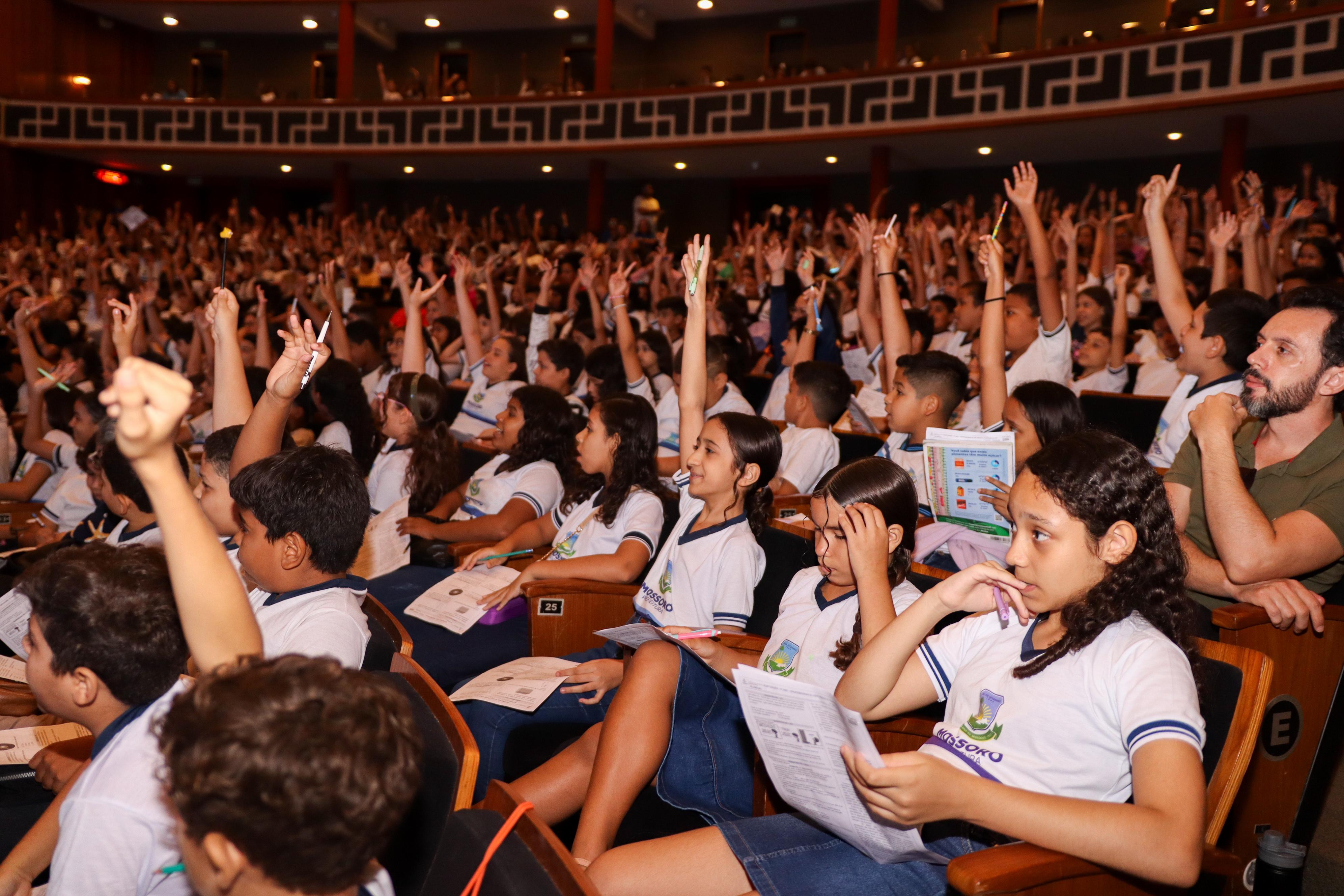 Teatro lotado e alunos atentos às orientações repassadas. Durante todo o dia de hoje turmas dos anos iniciais do Ensino Fundamental da Rede Municipal de Ensino participaram do 1º Aulão de preparação para o Sistema de Avaliação da Educação Básica (SAEB). As provas deste ano estão previstas para acontecerem no mês de setembro.