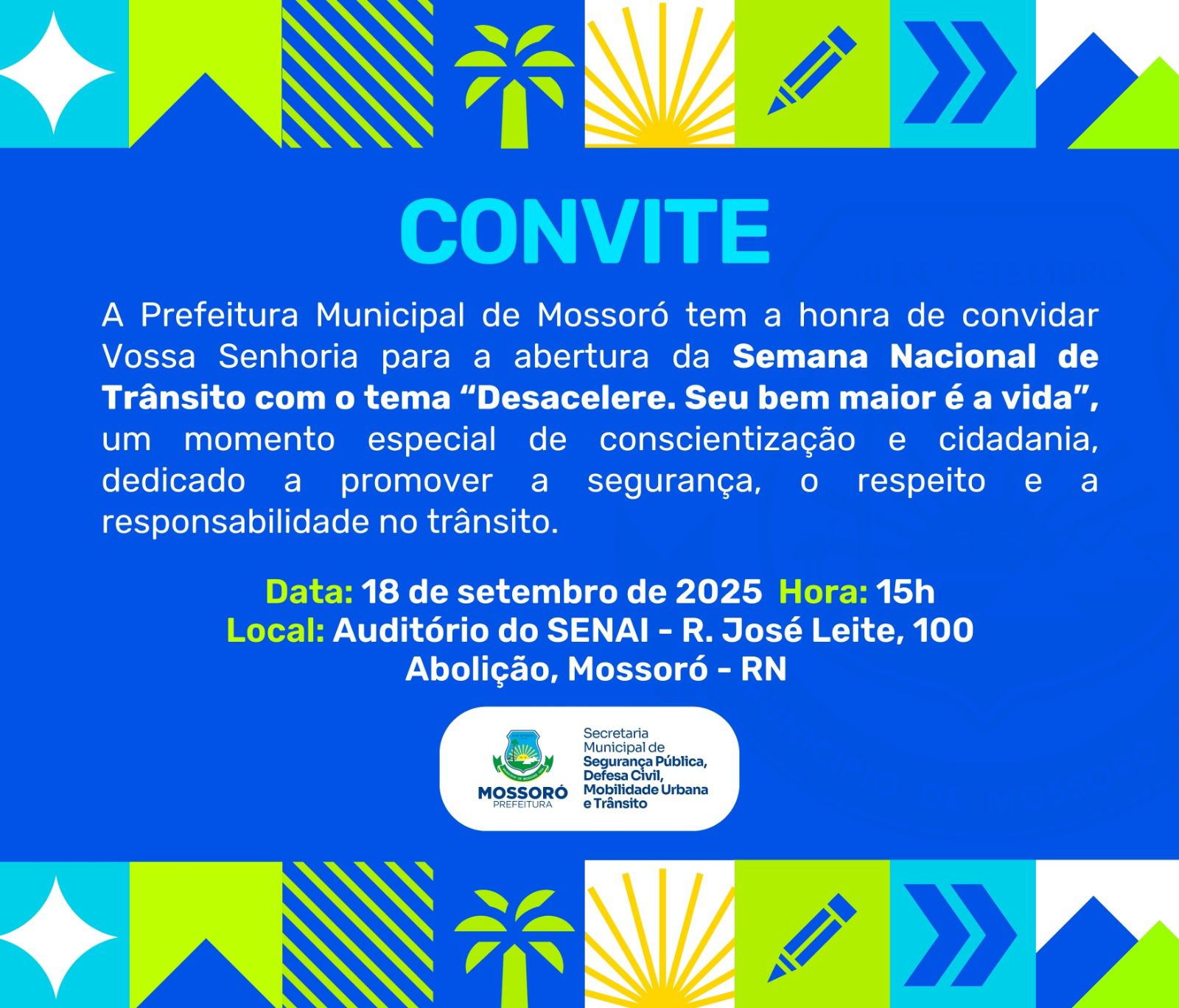 A Prefeitura de Mossoró, por meio da Secretaria de Segurança, Defesa Civil, Mobilidade Urbana e Trânsito (Sesdem), realiza nesta quinta-feira (18), às 15h, no Senai, a abertura oficial da Semana Nacional do Trânsito (SNT) 2025. O evento marca o início de uma programação que seguirá até o dia 25 de setembro, reunindo atividades educativas e de conscientização voltadas a toda a comunidade.