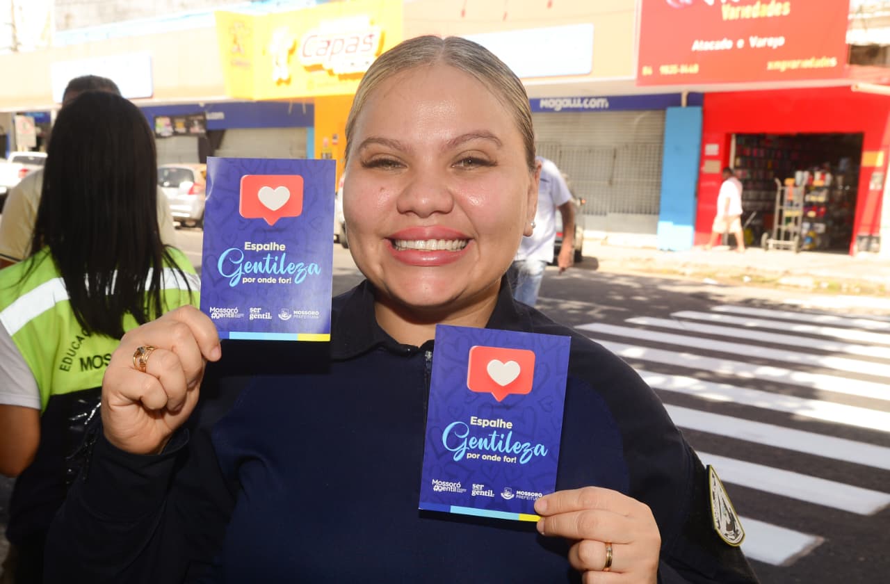 Em alusão ao Dia Mundial da Gentileza, a Prefeitura de Mossoró, por meio da Secretaria de Segurança, Defesa Civil, Mobilidade Urbana e Trânsito (Sesdem), promoveu, na manhã desta quinta-feira (13), uma ação conjunta entre agentes de trânsito, a Guarda Civil Municipal (GCM) e alunos da Rede Municipal. A iniciativa buscou despertar a empatia e o respeito entre pedestres, motoristas e motociclistas, ressaltando que a gentileza é um gesto que transforma e contribui para um trânsito cada vez mais humanizado e seguro.