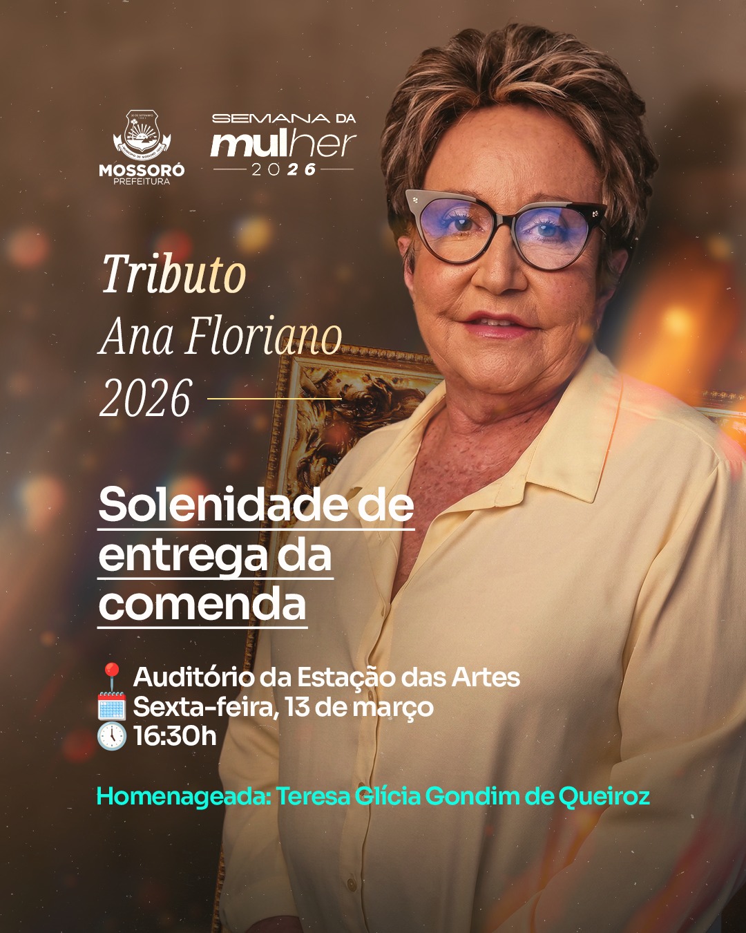 A Prefeitura Municipal de Mossoró homenageará, com o “Tributo Ana Floriano” 2026, a empresária Teresa Glícia Gondim de Queiroz. Em alusão ao “Dia Internacional da Mulher”, a solenidade de entrega da homenagem será realizada no auditório da Estação das Artes Elizeu Ventania, em 13 de março, a partir das 16h30.