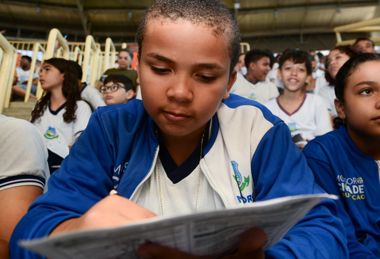 Em meio aos 1.500 alunos que estavam participando do aulão na manhã desta sexta-feira, o interesse de um aluno chamou a atenção. Enzo Gabriel Alves de Souza, 10 anos, autista, aluno do 5º ano da Escola Municipal Professor Manoel Assis, disse que gosta tanto de português quanto de matemática e que espera se sair muito bem na prova do Saeb. A professora de Enzo, Any Angélica, disse que ele é um aluno muito esforçado, dedicado e que se sai muito bem nas atividades. “Enzo é um aluno muito dedicado, gosta de ler, fazer as tarefas, gosta de se comunicar e só gosta de ler livros grandes. Ele vai se sair muito bem na avaliação”, pontuou Any Angélica.